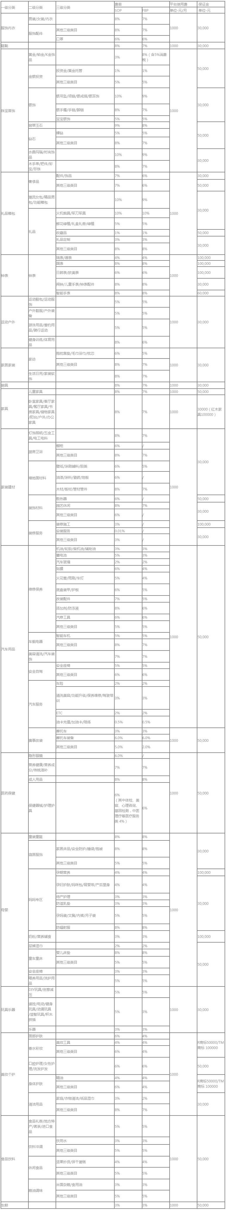 5.1.2 平臺開放平臺各經營類目對應的保證金標準詳見《平臺開放平臺經營類目資費一覽表》。